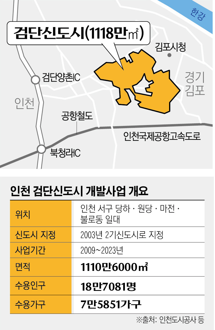 대부분의 신도시들이 원만하게 개발된 반면 검단신도시는 유독 곡절이 많았다. 대규모 토지보상에 하세월이 걸린 데다 2008년에 불어 닥친 글로벌 금융위기로 사업 규모가 1812만㎡에서 1110만6000㎡ 수준으로 축소됐다. 입주 가구 수는 9만2000가구에서 7만 가구로 쪼그라들었다. 중동 오일머니를 유치해 조성하려던 스마트시티 사업도 백지화됐다. 서울 접근성이 더 뛰어난 인천 계양지구 등이 3기 신도시에 포함된 것도 제대로 된 교통편 하나 없는 검단신도시엔 된서리였다.