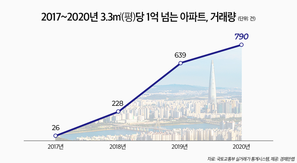 27일 부동산 정보업체 경제만랩이 국토교통부 실거래가 통계를 분석한 결과에 따르면, 지난해 3.3㎡당 1억 원 이상에 거래된 아파트 건수는 790건으로 집계됐다. 2017년 26건에 불과했던 것과 비교하면 3년 새 30배 늘어난 규모다.