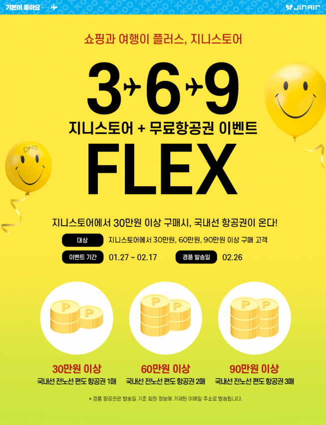 먼저 지니스토어에서 누적 구매금액별로 국내선 편도 항공권을 제공하는 ‘3-6-9 플렉스(FLEX)’ 이벤트를 펼친다. 이벤트 동안 △30만 원 이상 구매 시 국내선 편도 항공권 1매 △60만 원 이상 구매 시 2매 △90만 원 구매 시 3매를 증정한다. 항공권 탑승 기간은 3월 2일부터 6월 2일까지다.