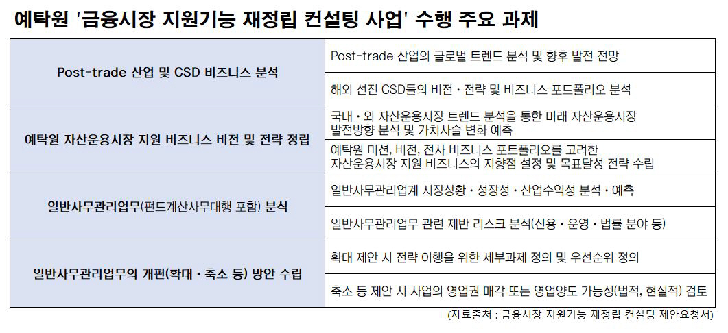 이번 컨설팅 과업지시서에 따르면, 예탁원은 “일체의 편향성을 배제하고 제3자적 시각에서 엄정한 객관성을 유지해 결론을 도출해달라”며 “일반사무관리업무 수행 여부, 수행 방향성, 리스크에 대한 내부 이해관계자의 시각차를 최대한 배제할 것”을 강조했다.
