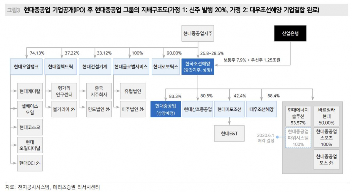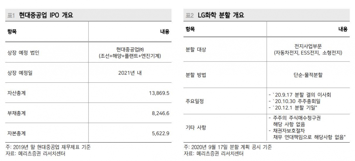 메리츠증권은 그룹 내 조선 중간 지주사인 한국조선해양의 자회사 현대중공업의 기업공개는 ‘LG화학의 전지사업 물적분할 계획’과 차이점이 있다고 판단했다.