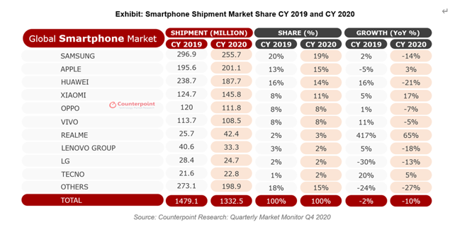 29일 글로벌 시장조사업체 카운터포인트가 발표한 보고서에 따르면 2020년 글로벌 스마트폰 시장에서 삼성전자는 출하량 2억5570만 대(19%)를 기록하며 1위 자리를 사수했다.