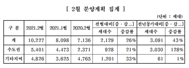 대한주택건설협회는 회원사를 대상으로 주택분양계획을 집계한 결과, 오는 2월, 15개사가 17개 사업장에서 총 1만227가구를 공급할 예정이라고 밝혔다. 이는 지난달(8098가구)과 비교하면 2129가구, 지난해 같은 기간(7136가구)과 비교하면 3091가구 증가한 수치다.