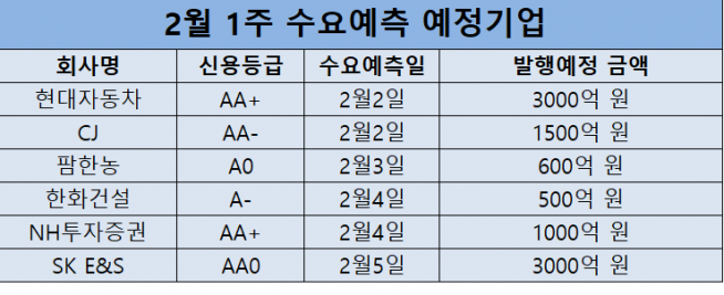 2월 1주(1~5일)에는 현대차, CJ, 팜한농, 한화건설, NH투자증권, SK E&S 등이 회사채 수요예측에 나선다.
