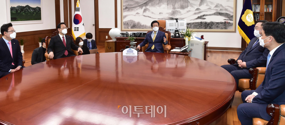 박병석 국회의장이 1일 서울 여의도 국회 의장실에서 김태년(더불어민주당), 주호영(국민의힘) 원내대표 등 여야 교섭단체와 주요 의사일정 및 법안 처리와 관련 회동을 갖고 있다.
