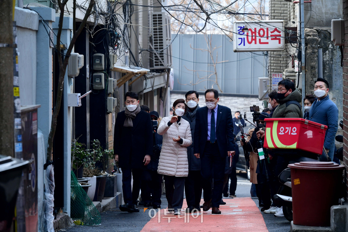 국민의힘 서울시장 보궐선거 예비후보인 나경원 전 의원이 1일 서울 용산구 동자동 쪽방촌을 살펴보고 있다.