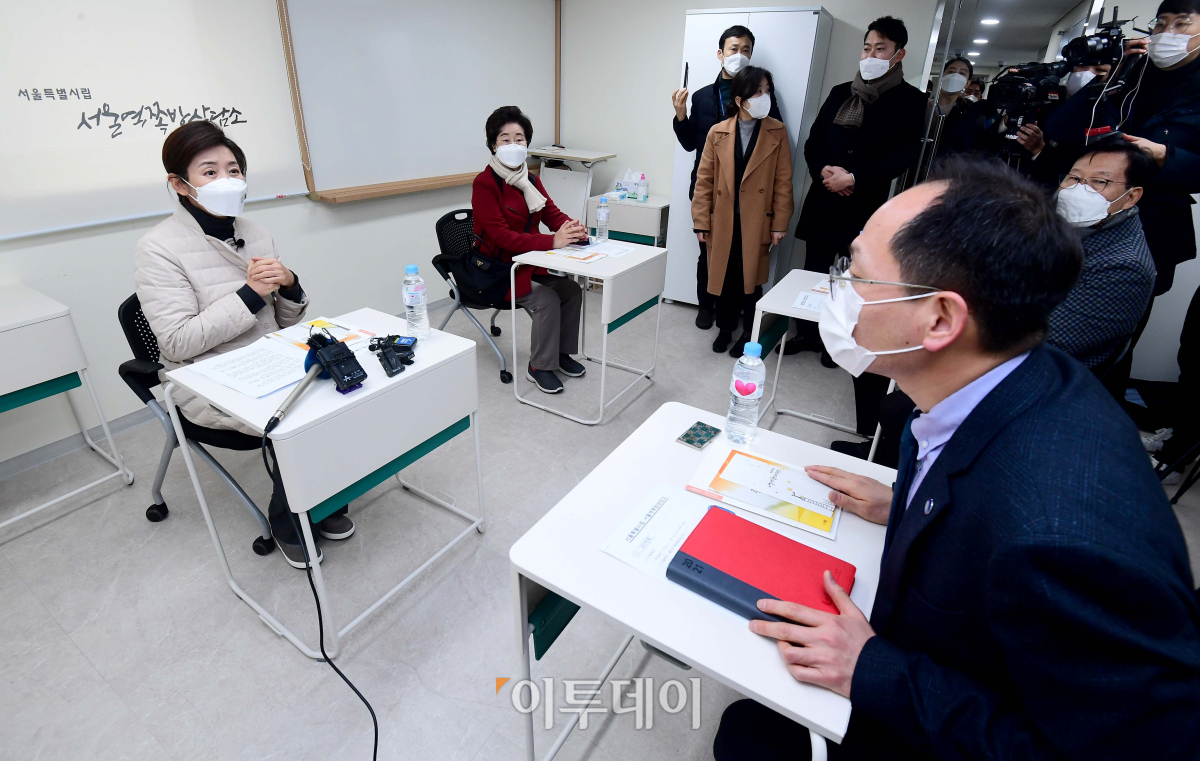 국민의힘 서울시장 보궐선거 예비후보인 나경원 전 의원이 1일 서울 용산구 동자동 서울특별시립 서울역쪽방상담소를 찾아 김갑록 소장 등 관계자들과 간담회를 갖고 있다.