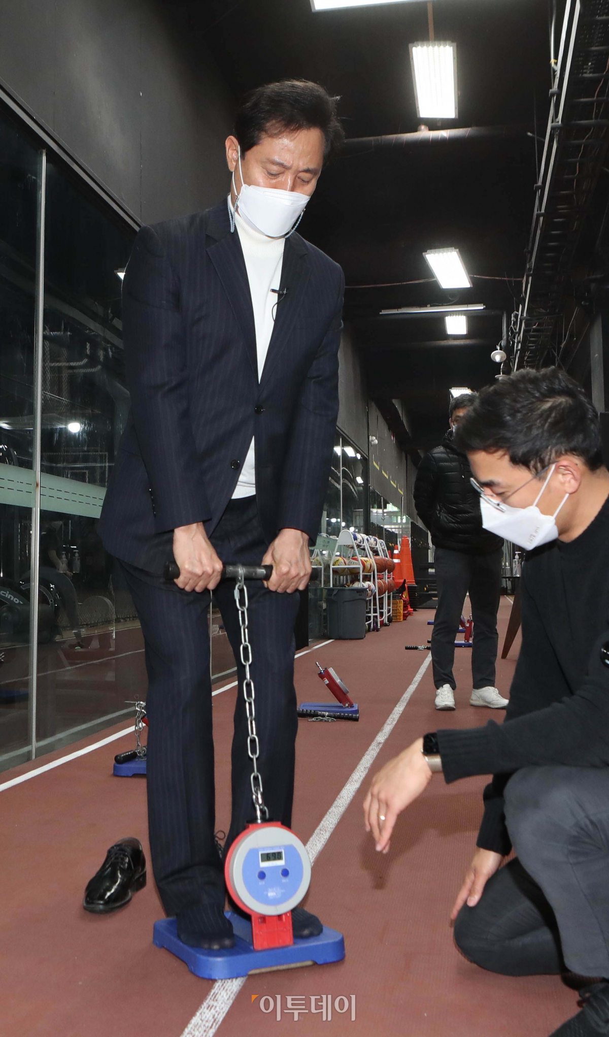 국민의힘 서울시장 후보경선에 출마한 오세훈 예비후보가 1일 오후 서울 대치동 GATE체육입시학원을 방문해 코로나방역과 관련한 현장의 목소리를 들었다. 오 예비후보가 체력측정기를 체험해 보고 있다. 국회사진취재단
