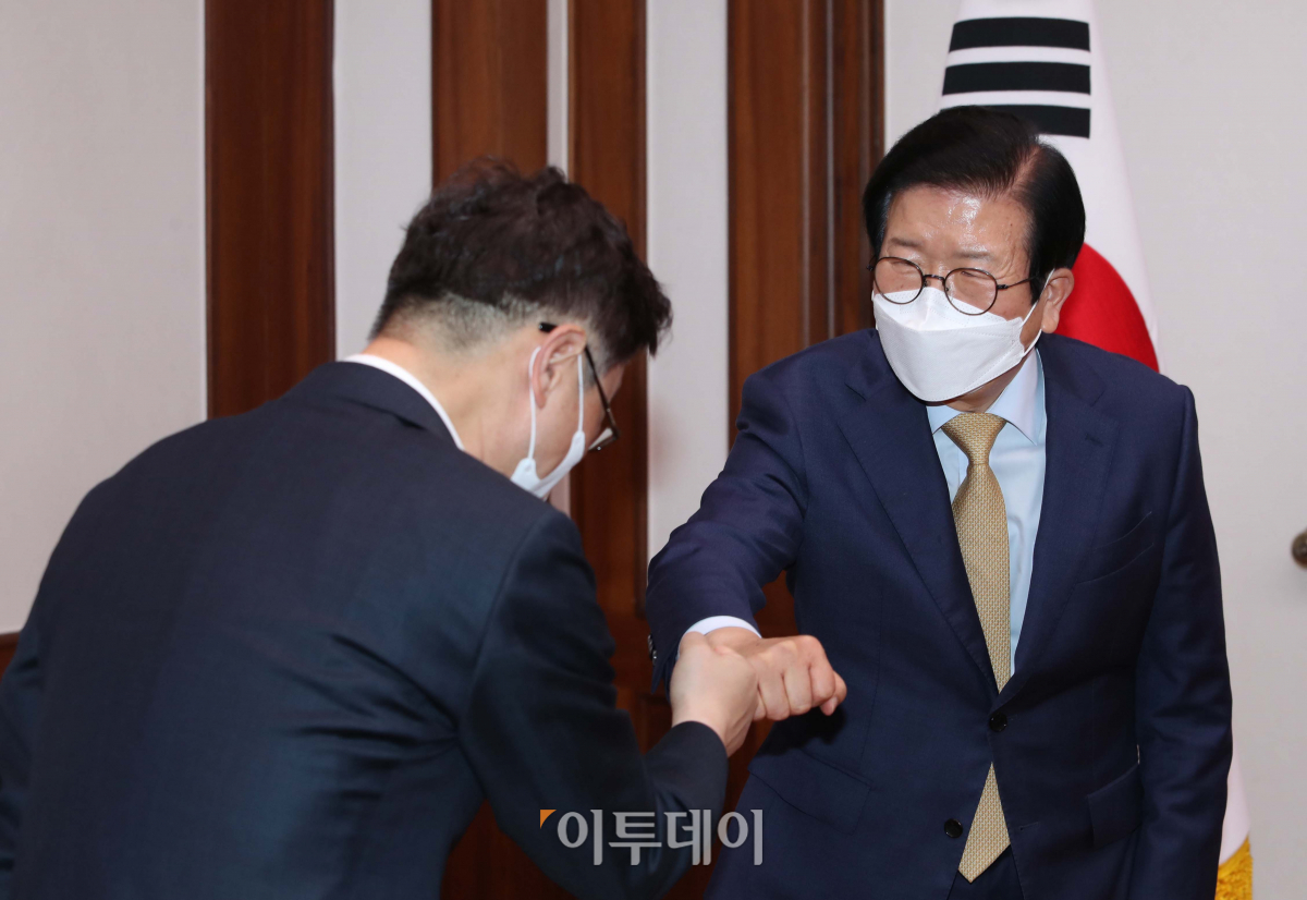 박병석 국회의장이 1일 오후 국회의장실을 예방한 박범계 법무부 장관과 인사를 하고 있다.