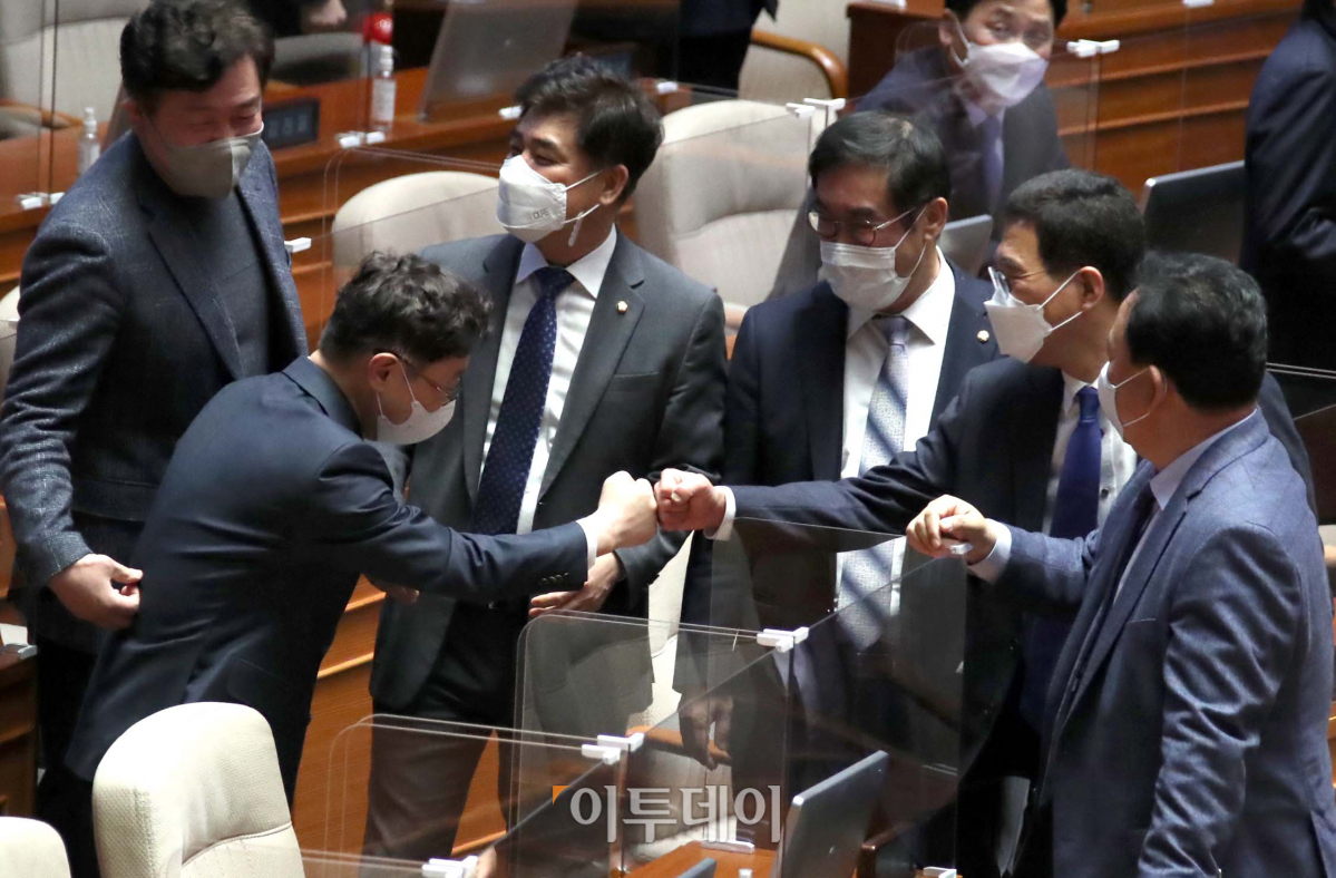박범계 신임 법무부 장관(왼쪽)이 1일 여의도 국회에서 열린 2월 임시국회에 참석 동료 의원들과 인사하고 있다.