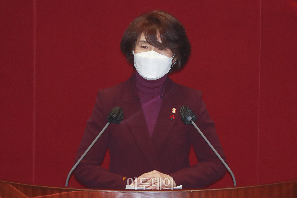 한정애 환경부 장관이 1일 오후 서울 여의도 국회에서 열린 본회의에서 인사말을 하고 있다.