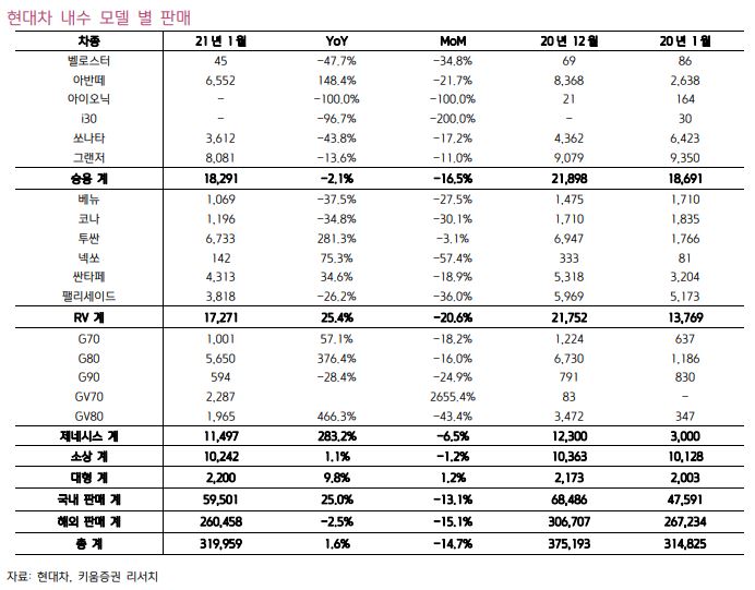 김민선 키움증권 연구원은 "현대차, 기아차 해외 판매는 각각 전년 대비 -2.5%, 0.6%로 평년 수준의 판매를 회복했으며, 연내 백신 보급과 경제 정상화와 국가별 부양책 등으로 인한 이연 수요를 기대한다"고 평가했다.