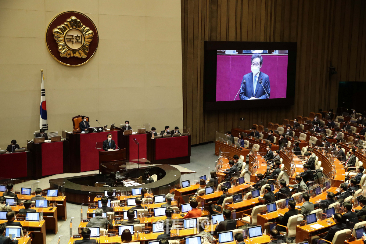더불어민주당 이낙연 대표가 2일 오전 국회에서 열린 본회의에서 교섭단체 대표연설을 하고 있다.