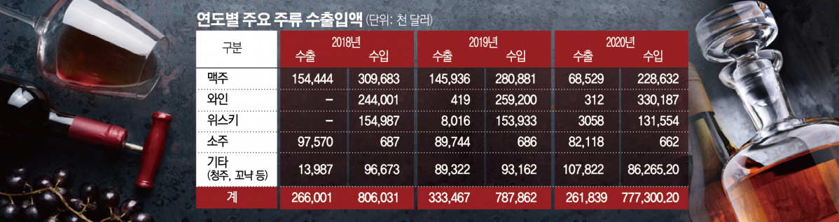 2일 주류산업협회가 관세청의 수출입동향을 분석한 주류 수출입통계에 따르면 주류 수입액은 2018년 8억 603만1000달러로 최대치를 기록한 후 2년 연속 역신장했다. 올해 수입액은 7억7730만200달러로 전년대비 1.34% 하락했으며 맥주, 위스키 등의 수입량이 크게 위축됐다. 반면 와인수입액은 사상 최대 수준을 경신하며 나홀로 성장을 이어갔다.