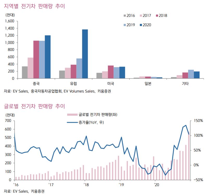 김지산 키움증권 연구원은 "지난해 팬데믹 국면에서도 전기차 시장은 41% 성장했다"며 "유럽이 강화된 친환경 정책에 힘입어 최대 시장으로 부상했고, 전기차 침투율이 두 자릿수에 도달하며 새로운 세상을 구현하고 있다"고 진단했다.