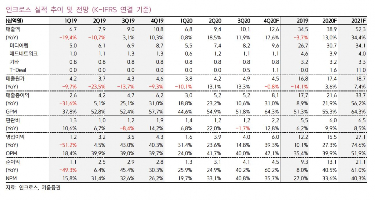 인크로스의 미디어렙 부문 영업이익률은 30% 후반으로 순도 높은 이익을 시현하고 있다. 키움증권이 예상하는 2020년 미디어렙 매출은 307억 원이다.