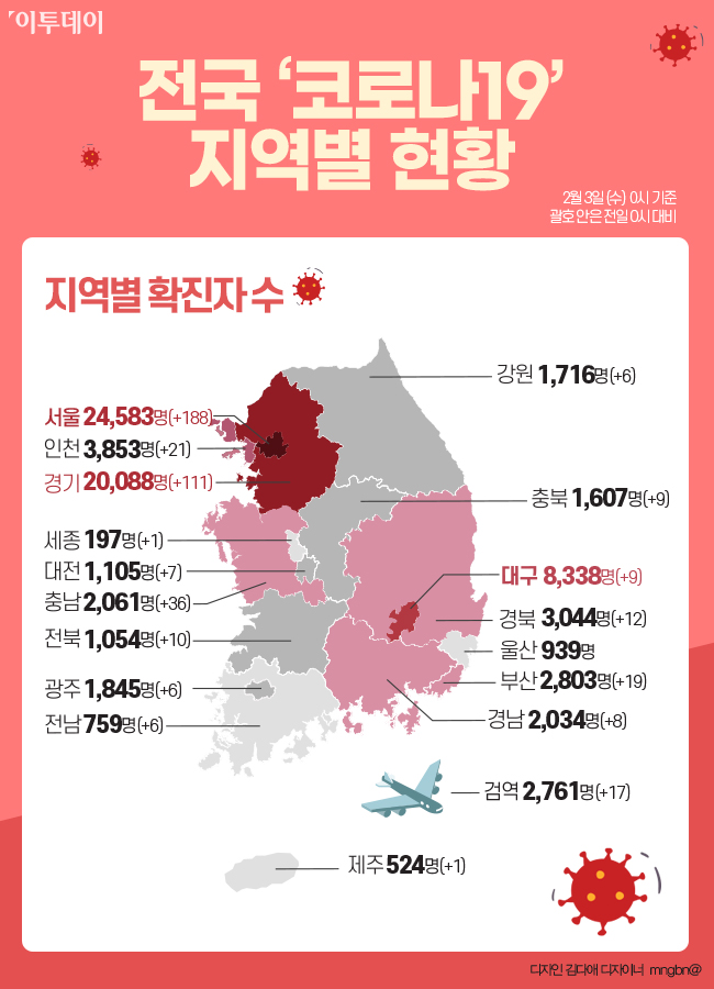 질병관리청 중앙방역대책본부에 따르면 2월 3일 0시 기준, 전일 0시 대비 467명이 추가 확진 판정을 받아 전국 확진자 수는 7만9311으로 늘었다.