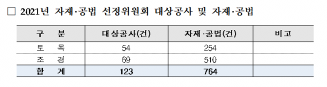 지난해에는 신종 코로나바이러스 감염증(코로나19)이 확산되는 상황에도 불구하고 59개 토목·조경 공사에서 225건, 815억 원 상당의 자재와 공법을 선정한 바 있다.