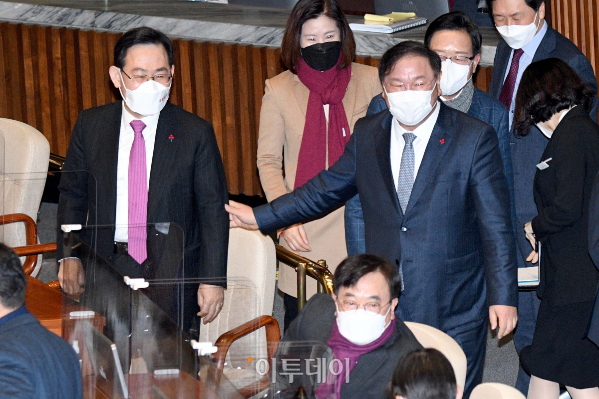 주호영 국민의힘 원내대표와 김태년 더불어민주당 원내대표가 3일 오전 서울 여의도 국회에서 열린 본회의에 참석해 인사하고 있다.