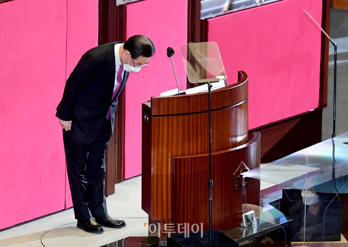 주호영 국민의힘 원내대표가 3일 서울 여의도 국회에서 열린 본회의에서 교섭단체 대표연설을 마친 뒤 인사하고 있다.