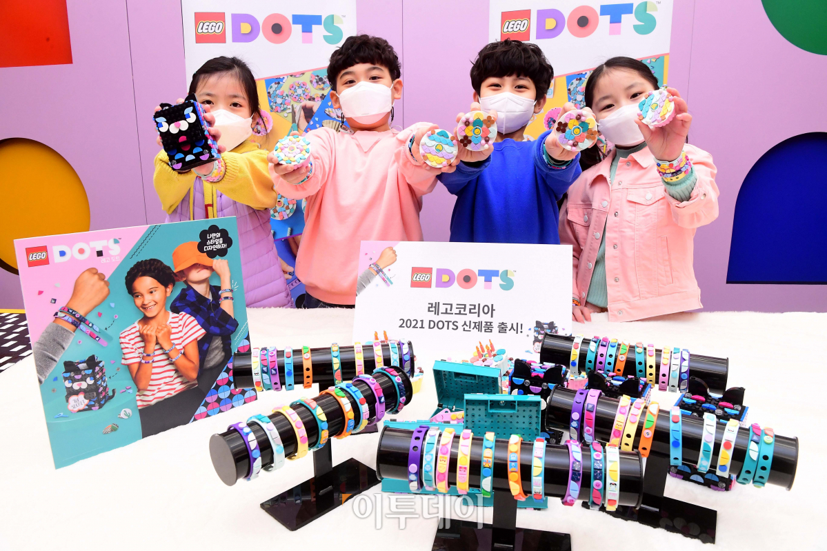 4일 서울 강남구 코엑스에 레고코리아가 설치한 ‘하우스 오브 도트’에서 열린 ‘레고 도트(LEGO DOTS)’ 시리즈 출시 행사에서 어린이 모델들이 레고 타일 조각을 조립해 만든 팔찌, 탁상용 장식품 등을 선보이고 있다. 레고코리아는 2021년을 맞이해 어린이들이 DIY(Do It Yourself)로 패션용품과 집안 장식품을 만들 수 있는 ‘도트’ 시리즈를 발매했다. 신태현 기자 holjjak@