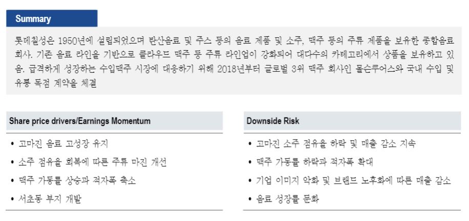 조 연구원은 “음료 부문도 신종 코로나바이러스 감염증(코로나19) 타격으로 베이스 부담이 전혀 없는 상태”라면서 “전방산업의 회복, 제품 및 채널 다각화, 비용 절감 노력, 가격 인상 효과 등을 기반으로 완연한 실적 개선이 나타날 것으로 예상”이라고 덧붙였다.