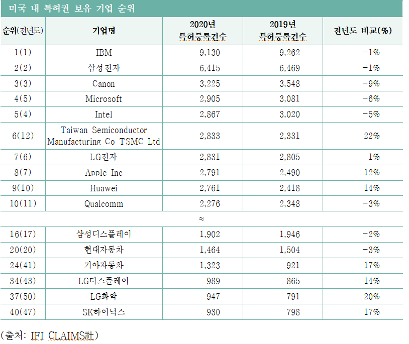 이밖에 40위 내 특허권을 획득한 한국 기업은 LG전자 2831건(7위), 삼성디스플레이 1902건(16위), 현대자동차 1464건(20위), 기아자동차 1323건(24위), LG디스플레이 989건(34위), LG화학 947건(37위), SK하이닉스 930건(40위) 등 7개다.