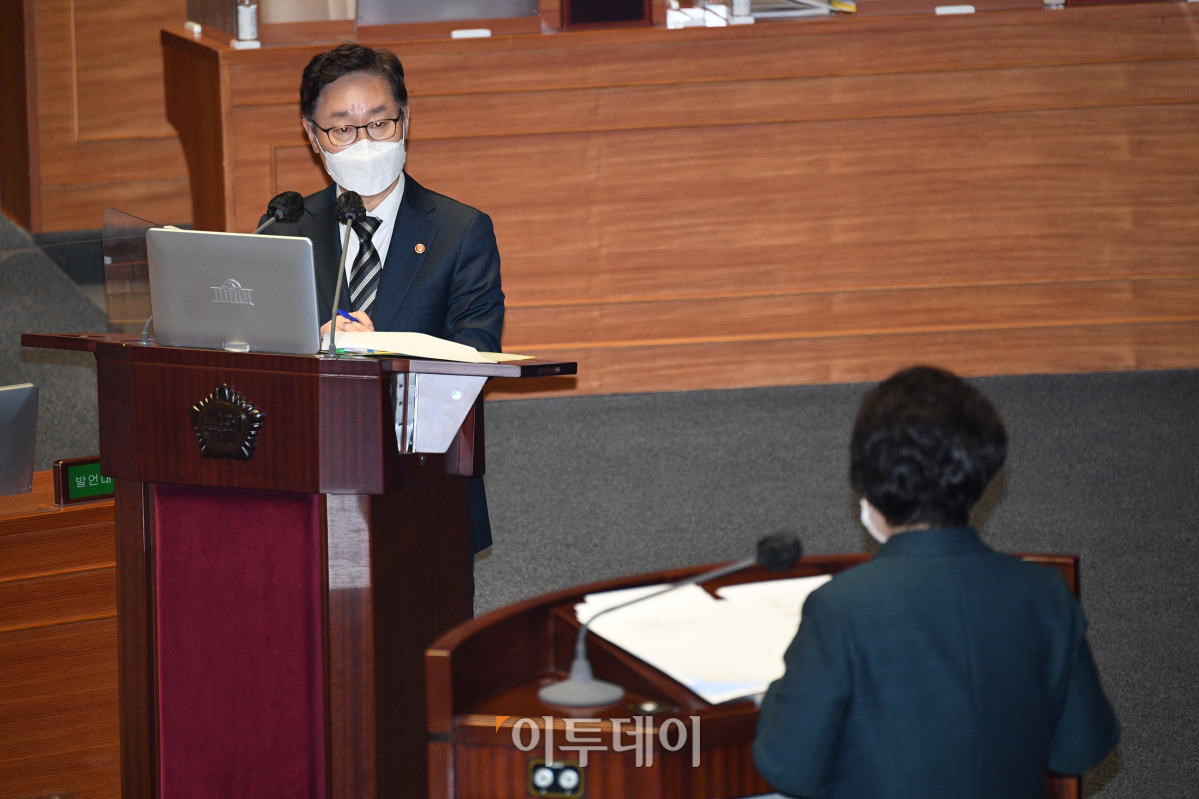 박범계 법무부 장관이 8일 오후 서울 여의도 국회에서 열린 교육·사회·문화에 관한 대정부질문에 출석해 정춘숙 더불어민주당 의원의 질의에 답변하고 있다.