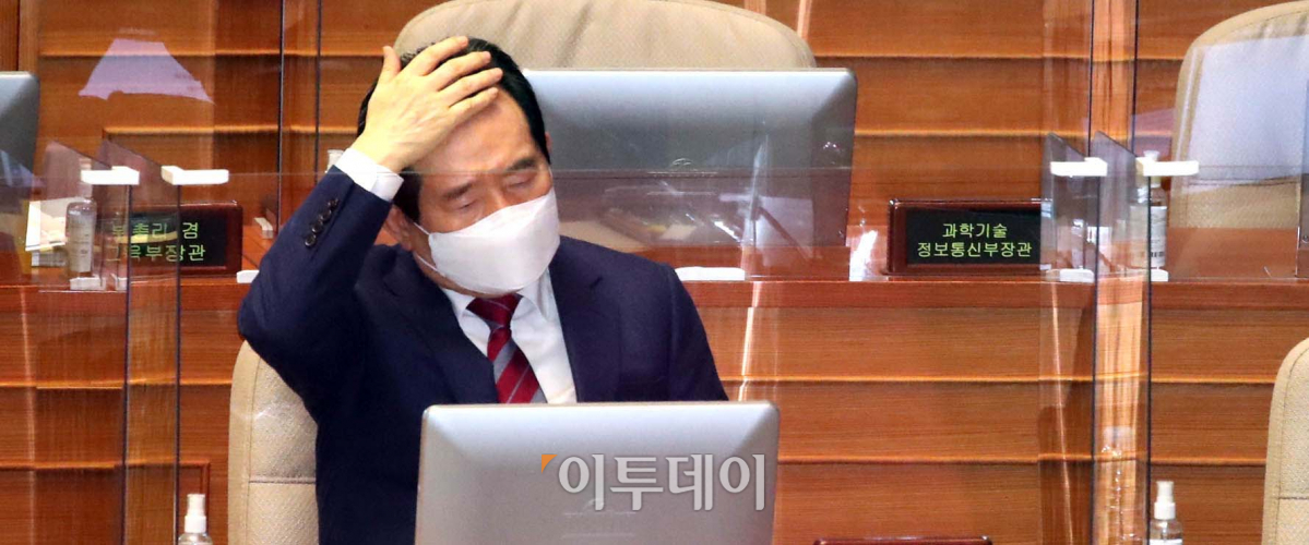 정세균 국무총리가 8일 국회 본회의에 출석해 머리를 만지고 있다.