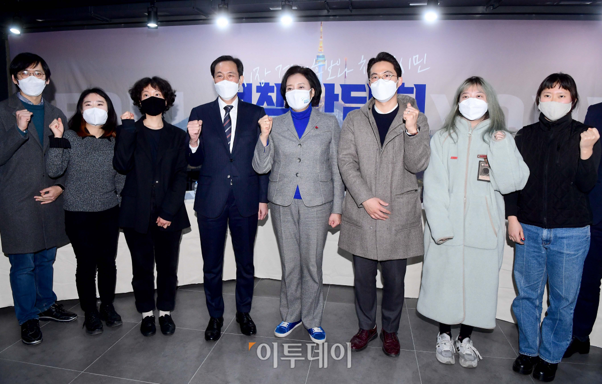 서울시장 보궐선거에 출마한 우상호 더불어민주당 예비후보와 박영선 예비후보가 8일 서울 마포구 복합문화공간 그늘에서 열린 더불어민주당 서울시장 경선후보와 청년시민 정책간담회에 앞서 기념촬영을 하고 있다.