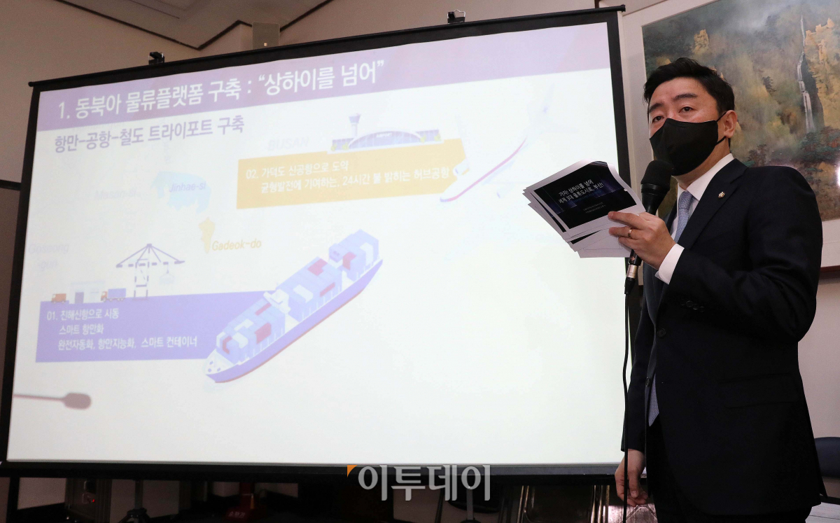 강훈식 더불어민주당 지역균형뉴딜 분과위원장이 9일 서울 여의도 국회에서 열린 동남권 신경제엔진 추진전략 발표 및 토론회에서 '트라이포트 구축과 기대효과, 향후과제'를 발표하고 있다.
