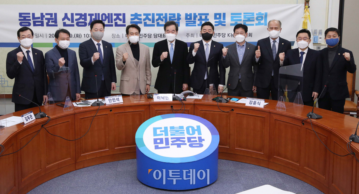 이낙연 더불어민주당 대표가 9일 서울 여의도 국회에서 열린 동남권 신경제엔진 추진전략 발표 및 토론회에서 참석자들과 기념촬영을 하고 있다. 왼쪽부터 민홍철, 이광재, 김두관, 안민석 의원, 이낙연 대표, 강훈식, 김정호, 이용우, 최인호, 김영배 의원.
