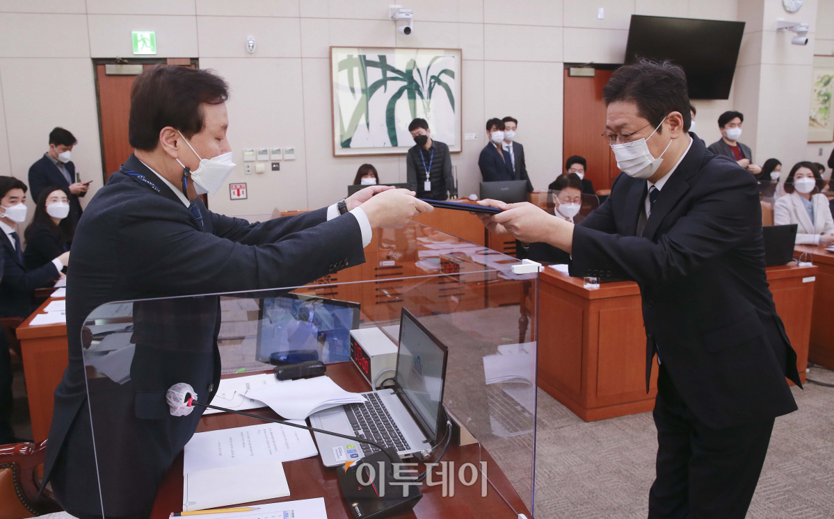도종환 위원장이 9일 오전 서울 여의도 국회에서 열린 문화체육관광위원회 인사청문회에서 황희 후보자에게 선서문을 받고 있다.