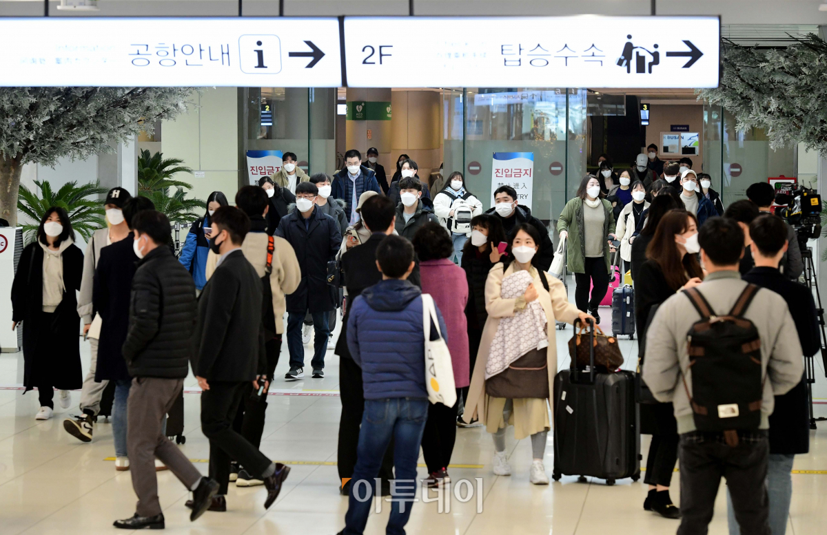 설 연휴 마지막 날인 14일 서울 강서구 김포공항 국내선 청사가 귀경객들로 붐비고 있다.