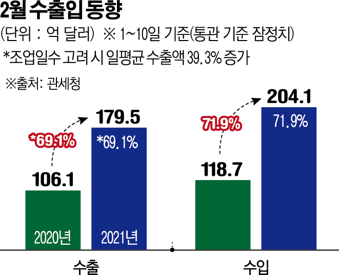 2월 1~10일까지 수출금액이 전년 동기 대비 70%가량 급증했다. 반도체, 무선통신기기, 승용차 수출이 이같은 상승을 이끌었다.