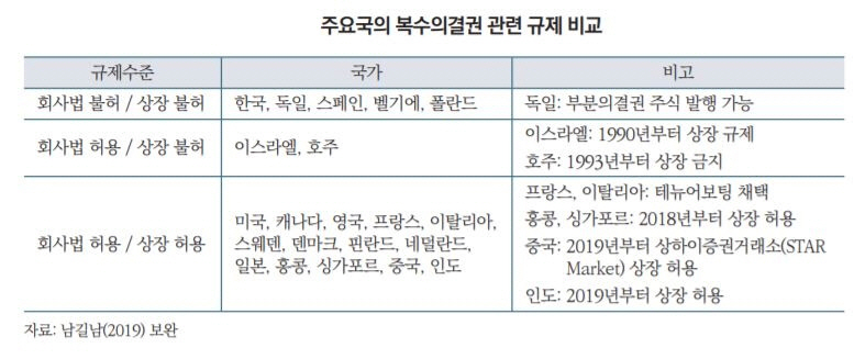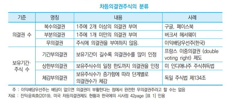반면 김우찬 고려대 교수는 지난해 국회에서 열린 토론회에서 “국내에서도 무의결권 주식이 도입됐지만 발행 실적은 전무하다”며 “의결권이 배제된 주식을 매입하며 자본을 제공할 투자자가 없다는 증거”라고 지적했다.