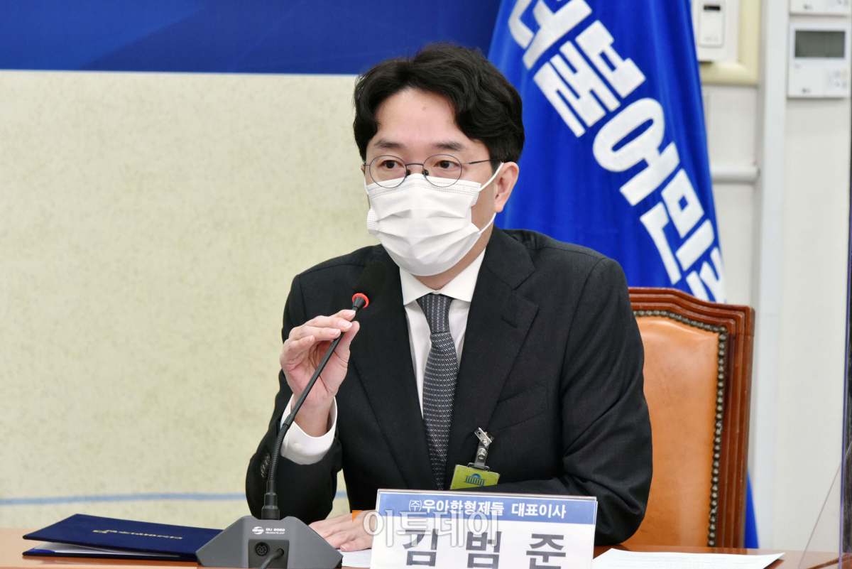 김범준 우아한형제들 대표이사가 15일 오전 서울 여의도 국회 당대표회의실에서 열린 을지로위원회와 배달의민족-자영업자 상생협약식에서 인사말을 하고 있다.