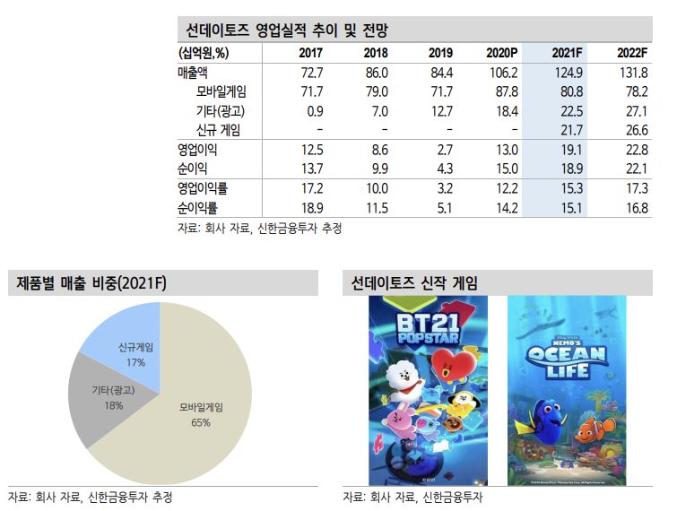 신한금융투자는 17일 선데이토즈가 올해 신작 출시로 매출과 영업이익이 전년 대비 각각 18.0%, 47.0% 증가할 것으로 내다봤다. 하지만 목표주가는 따로 제시하지 않았다.