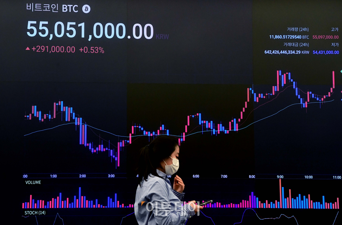 비트코인이 뉴욕에서 장중 5만548달러에 거래되면서 사상 처음 5만달러(한화 약 5500만원)를 돌파한 17일 서울 강남구 암호화폐 거래소 업비트 라운지 시세 전광판에 비트코인 가격이 표시되고 있다.