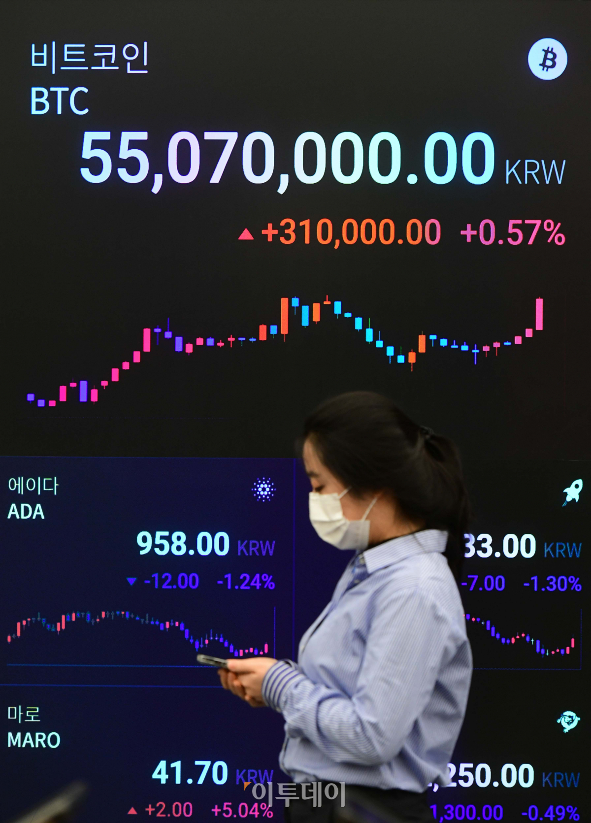 비트코인이 뉴욕에서 장중 5만548달러에 거래되면서 사상 처음 5만달러(한화 약 5500만원)를 돌파한 17일 서울 강남구 암호화폐 거래소 업비트 라운지 시세 전광판에 비트코인 가격이 표시되고 있다.
