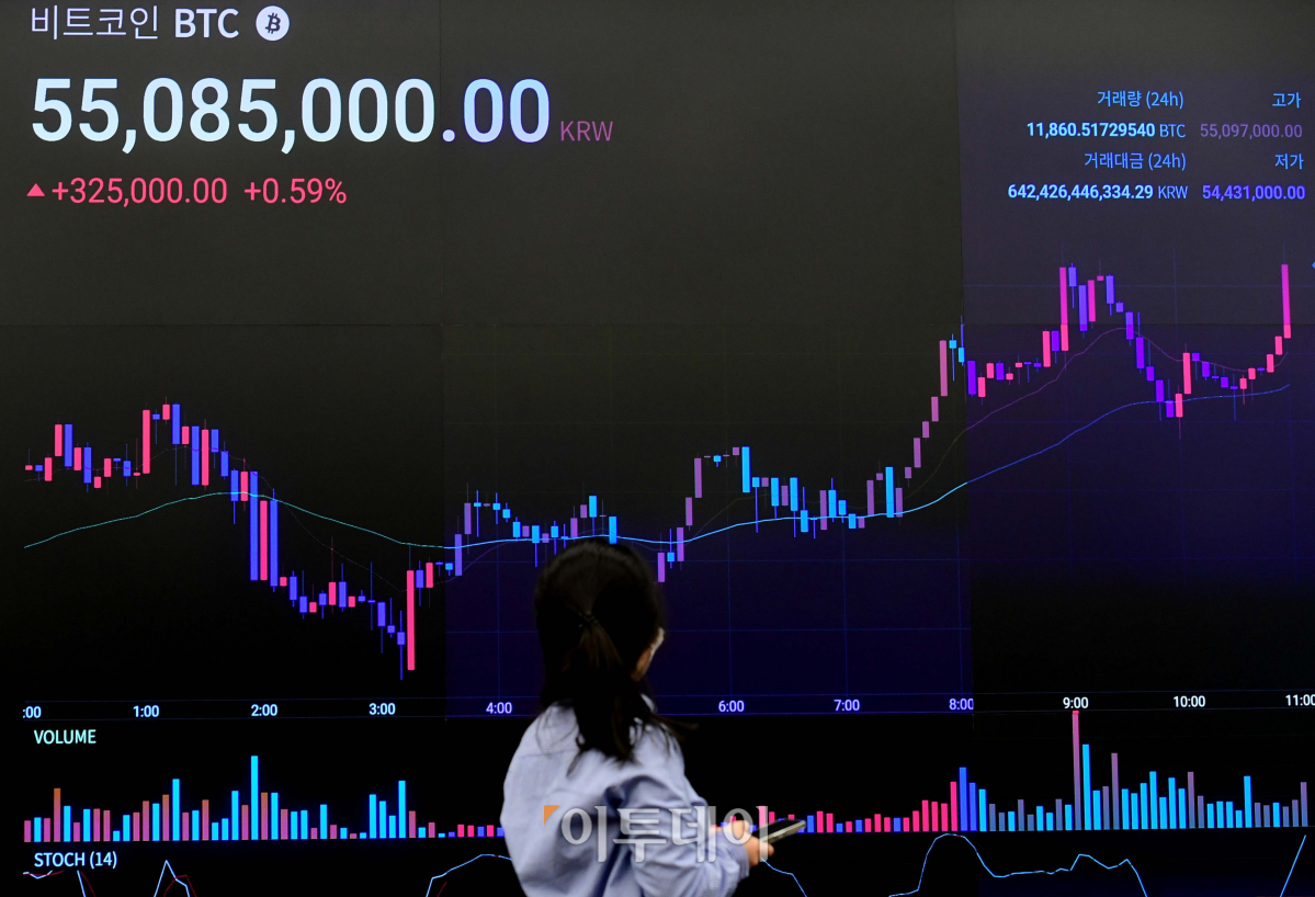 비트코인이 뉴욕에서 장중 5만548달러에 거래되면서 사상 처음 5만달러(한화 약 5500만원)를 돌파한 17일 서울 강남구 암호화폐 거래소 업비트 라운지 시세 전광판에 비트코인 가격이 표시되고 있다.