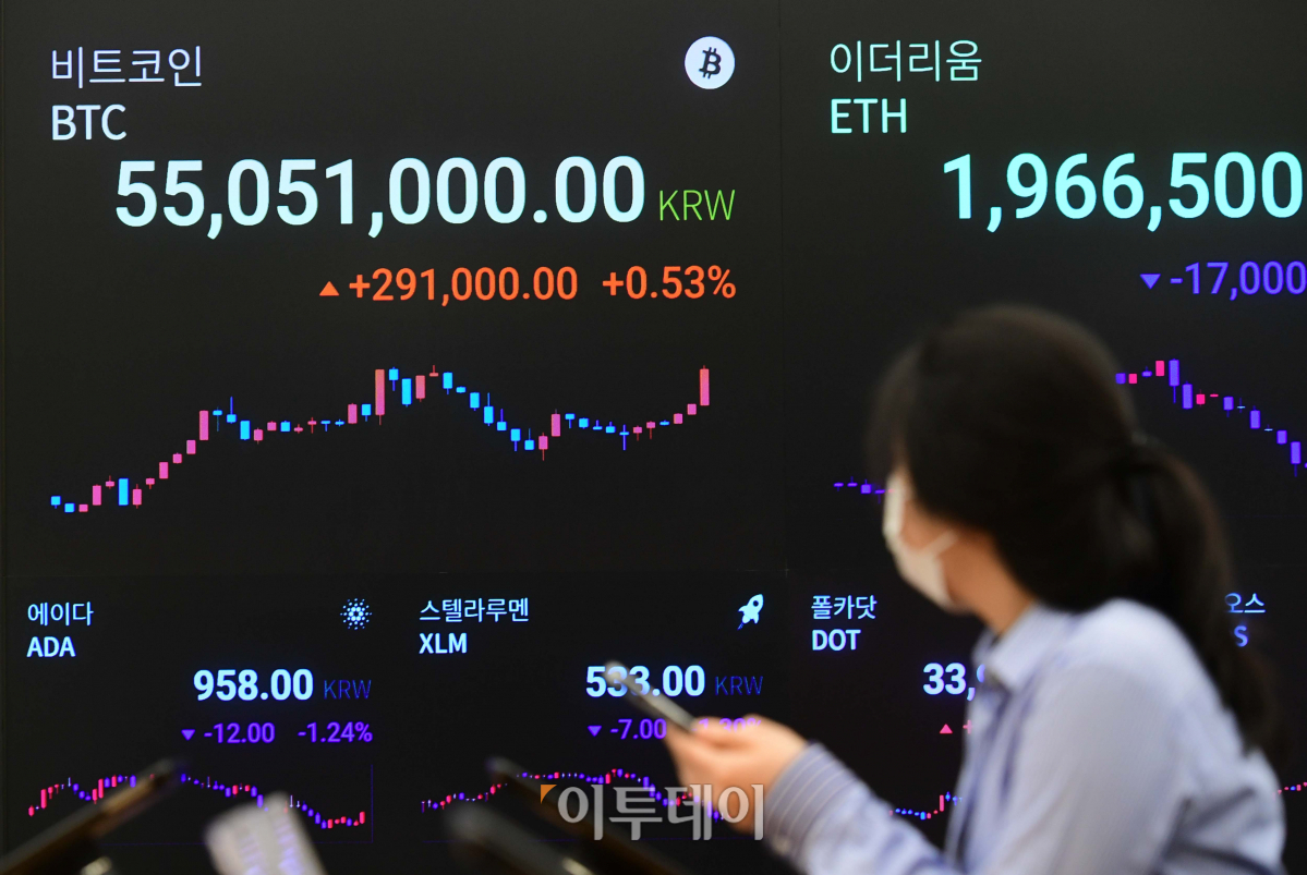 비트코인이 뉴욕에서 장중 5만548달러에 거래되면서 사상 처음 5만달러(한화 약 5500만원)를 돌파한 17일 서울 강남구 암호화폐 거래소 업비트 라운지 시세 전광판에 비트코인 가격이 표시되고 있다.