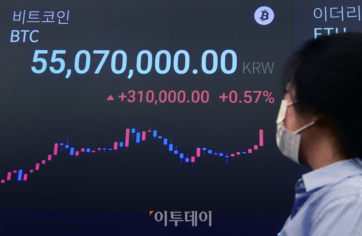 비트코인이 뉴욕에서 장중 5만548달러에 거래되면서 사상 처음 5만달러(한화 약 5500만원)를 돌파한 17일 서울 강남구 암호화폐 거래소 업비트 라운지 시세 전광판에 비트코인 가격이 표시되고 있다.