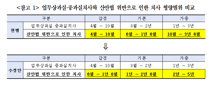 양형기준 수정안에선 산안법 위반으로 인한 치사에 대한 기본 형량을 기존 8개월~2년에서 1년~2년 6개월로 제시했다. 가중 형량은 기존 1~3년에서 2~5년으로 바뀌었다.