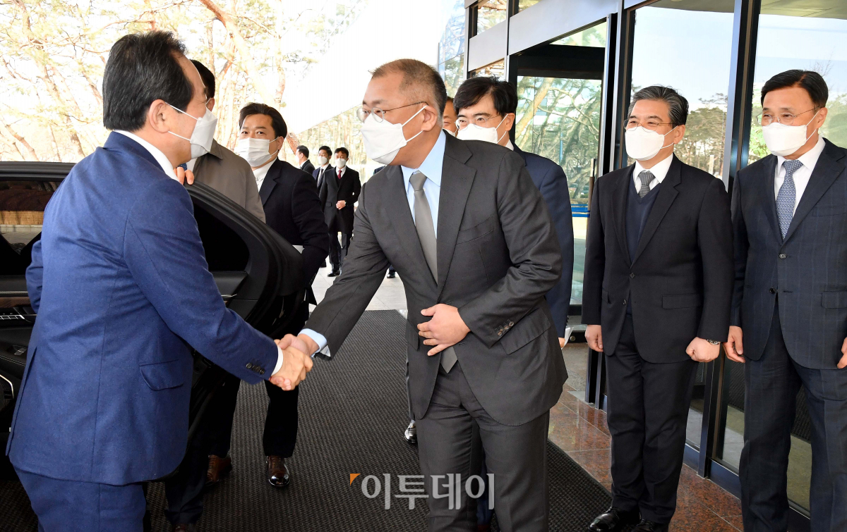 정세균 국무총리가 18일 오전 경기도 화성시 현대자동차 남양기술연구소를 찾은 가운데 정의선 현대자동차그룹 회장과 인사하고 있다.