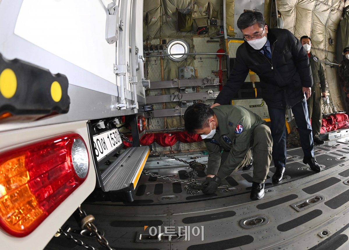 19일 경기도 성남 서울공항에서 열린 백신 유통 제2차 범정부 통합 모의훈련에서 서욱 국방부 장관이 공군 수송기에 실린 코로나19 백신 수송차량 고정 작업을 하는 군 관계자를 격려하고 있다. 금일 훈련은 도서지역에 대한 민간 항공수송이 제한될 경우 군 항공기에 백신 수송차량을 탑재해 수송하는 훈련이다. 사진공동취재단