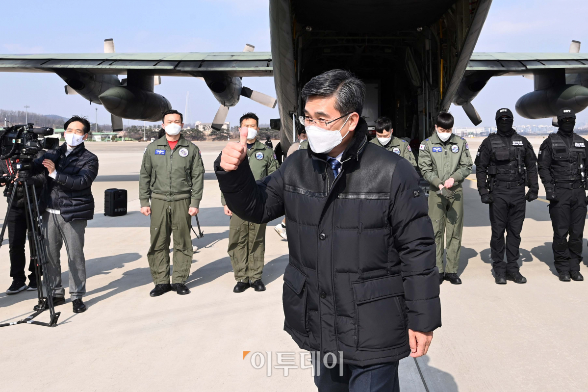 19일 경기도 성남 서울공항에서 열린 백신 유통 제2차 범정부 통합 모의훈련에서 서욱 국방부 장관이 관계자들을 격려한 후 떠나고 있다. 금일 훈련은 도서지역에 대한 민간 항공수송이 제한될 경우 군 항공기에 백신 수송차량을 탑재해 수송하는 훈련이다. 사진공동취재단