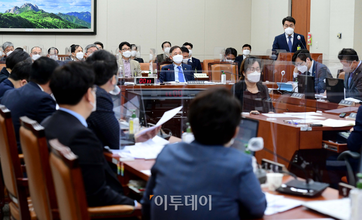 최정우 포스코 회장이 22일 서울 여의도 국회에서 열린 환경노동위원회 산업재해관련 청문회에서 김웅 국민의힘 의원의 질의에 답하고 있다.
