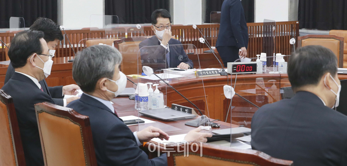 박지원 국가정보원장이 22일 오후 서울 여의도 국회에서 열린 정보위원회 전체회의를 준비하고 있다.