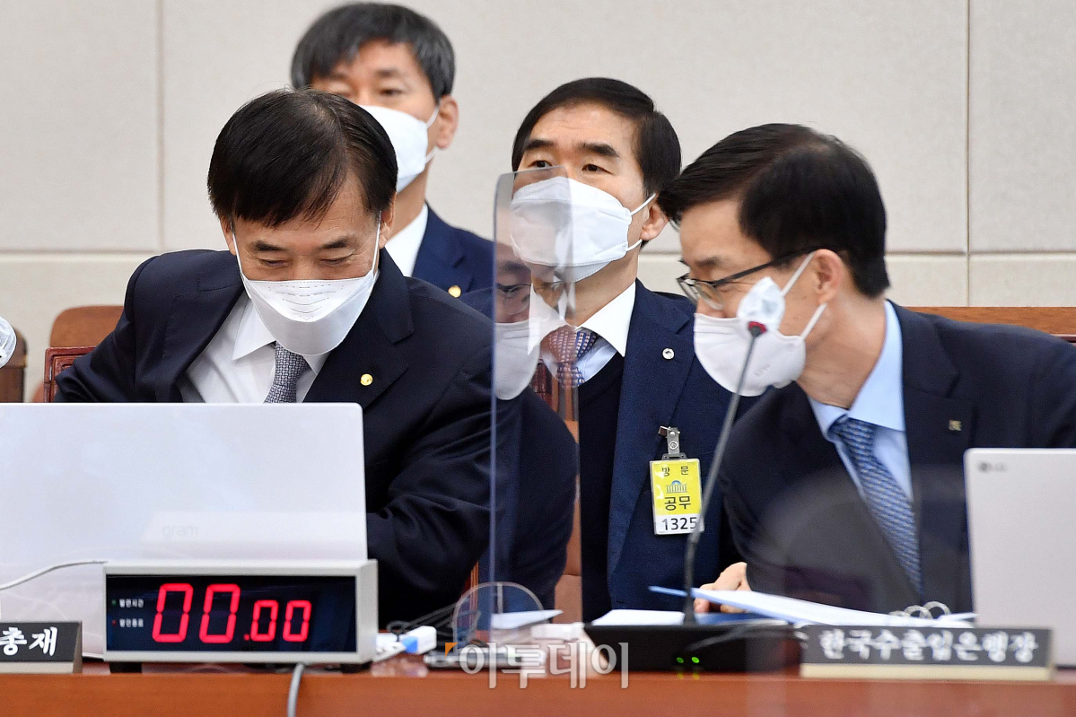 이주열 한국은행 총재가 23일 오전 서울 여의도 국회에서 열린 기획재정위원회 전체회의에 출석해 방문규 한국수출입은행장과 대화하고 있다.